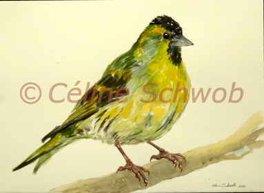 Eurasian siskin, original watercolor on paper, 11" x 15", 2022
