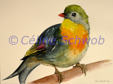 Red-billed leiothrix, watercolor on paper, 11" x 15", 2022